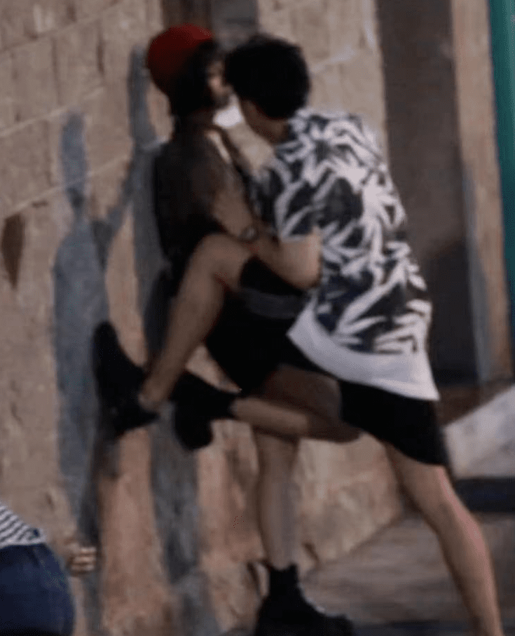 照片中男生把女生“壁咚”,一只脚抵在墙上圈住女生,一只手疑似放在奇怪的位置……