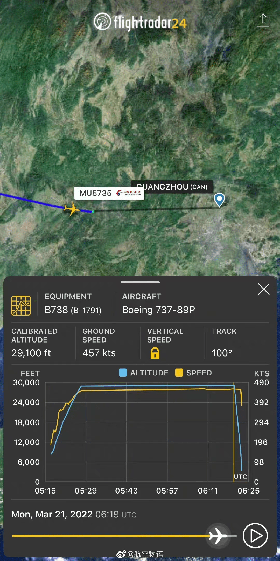2点21分,MU5735航班丢失ADS-B雷达信号,同地面失联。
