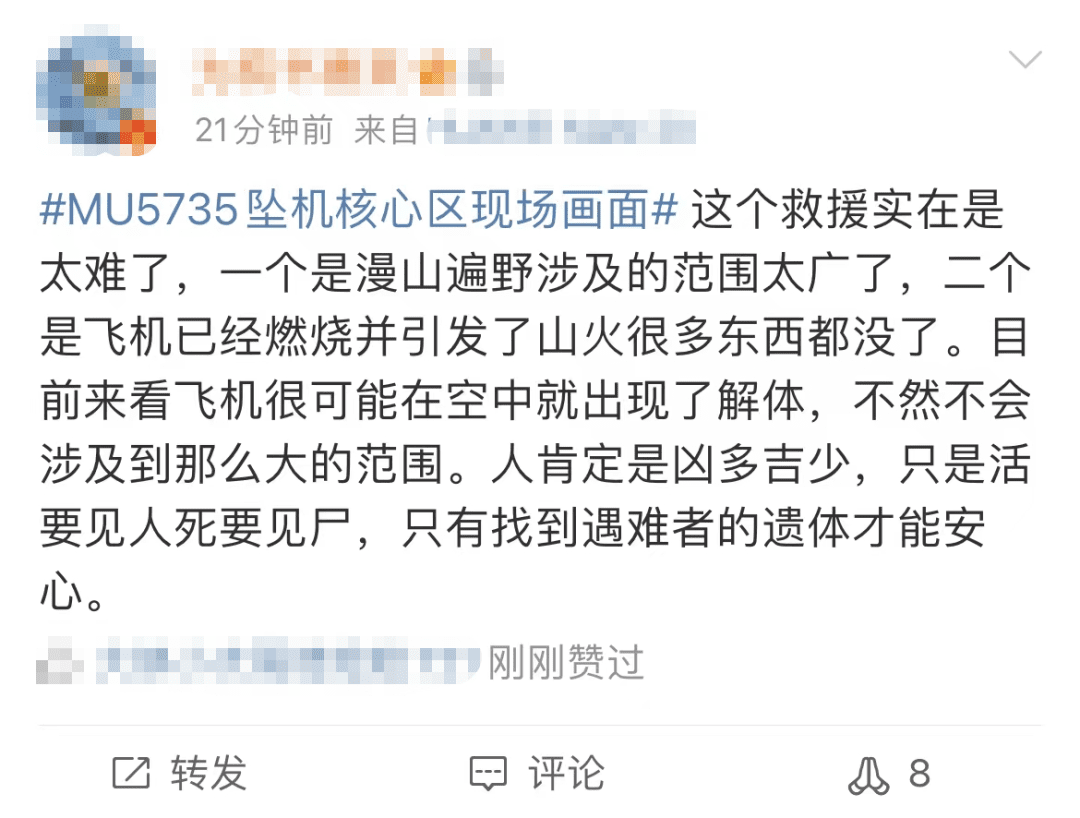 网友看了之后纷纷感觉心碎,一点点的飞机残骸足以显示撞击的一瞬间有多惨,救援有多难。