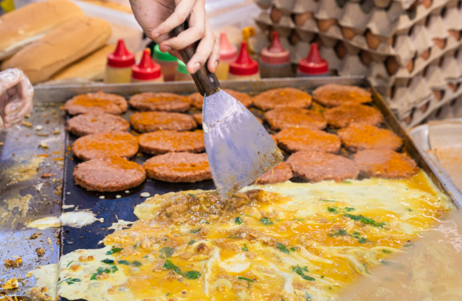马来汉堡Ramly Burger的名称,在新加坡的你们一定知道!在这个摊位,汉堡全是现点现烤,起价只要4.5新币,吃一个就很有饱足感了!