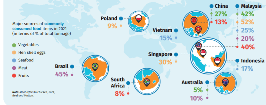 虽然大部分仍集中在亚洲国家,但是,像是巴西、南非、波兰等其他国家,也为新加坡的提供了所需的鸡蛋、水果和肉类。
