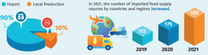 2019年至2021年,新加坡从国外进口的食品来源国家和地区,一路上升,现在已有180个。