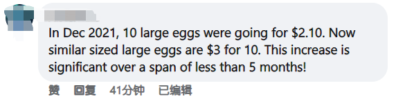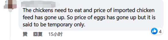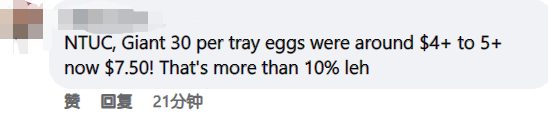 “NTUC和Giant超市之前30个鸡蛋只要4-5新币,现在要7.5新币!这已经涨了不止10%了!”