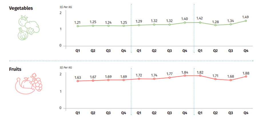 其他像是蔬菜和水果,去年的价格,每公斤也比三年前要高出2毛多。