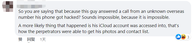 “所以你是说因为这个人接听了一个陌生海外号码的电话,所以他的电话被黑了?听起来不可能,因为不可能。更有可能发生的事情是他的 iCloud 帐户被访问了,这就是黑客能够获取他的照片和联系人列表的方式。”