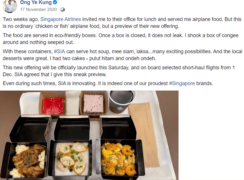 这个新加坡乘客后来发送邮件调查表向新航提供了第一餐的负面反馈。