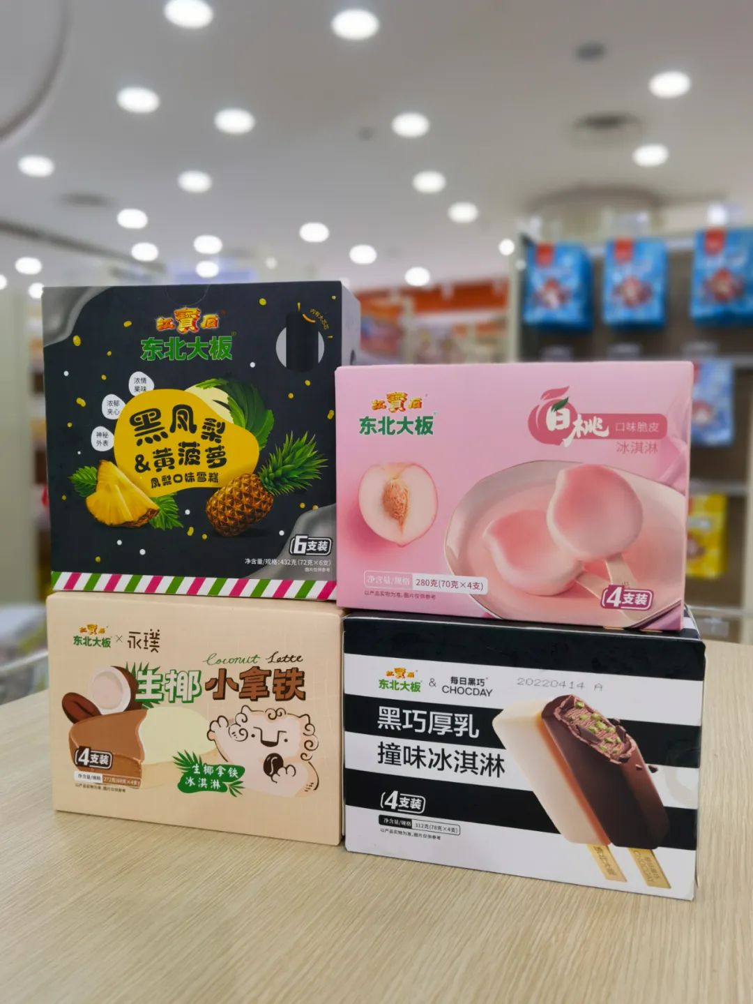 这次淡滨尼店还同步更新了四款最新口味的东北大板,分别是杨枝甘露燕麦奶雪糕,黑巧厚乳撞味冰淇淋,黑金凤梨口味雪糕以及生椰小拿铁。