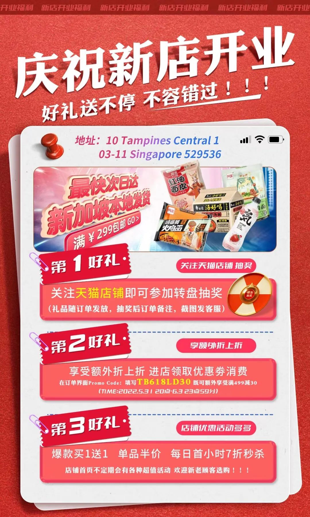 开业庆典之际,淘宝搜索“坤海旗舰店”,60新币全岛包邮,足不出户尽享国货美食~