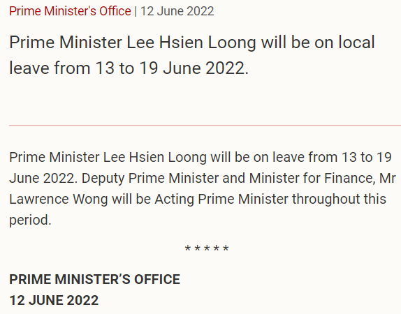 上任的时间是6月13日,也就是今天,也是李显龙总理开始休假的日子。