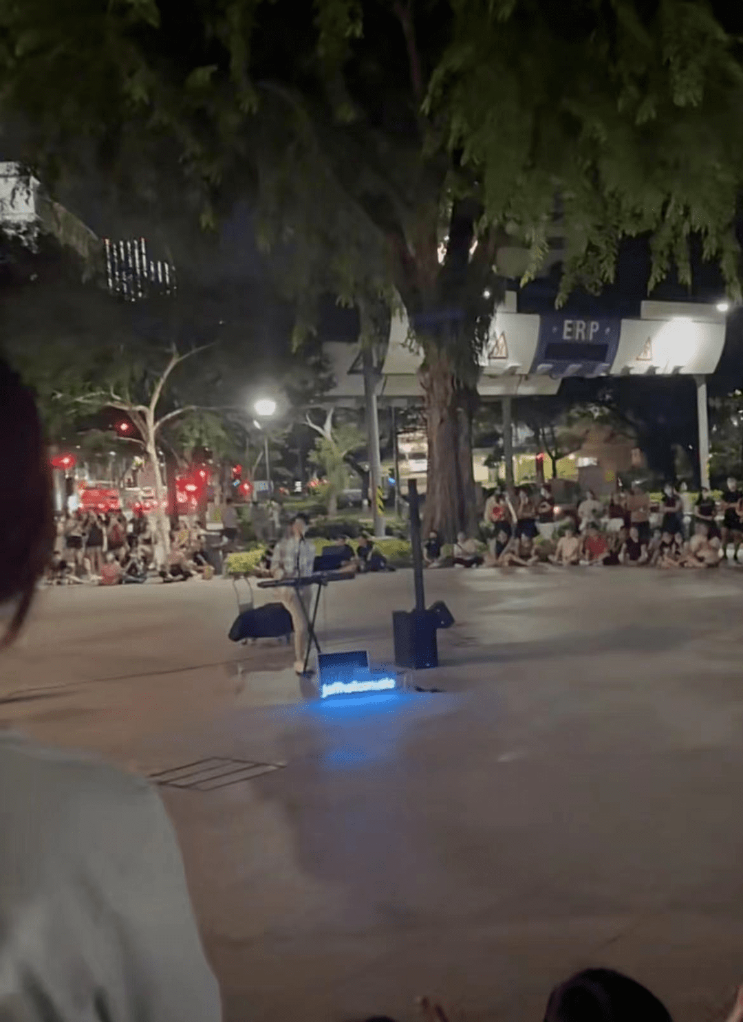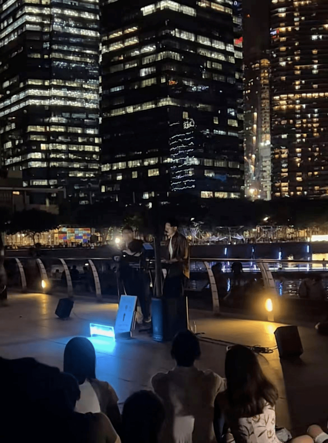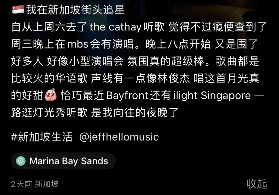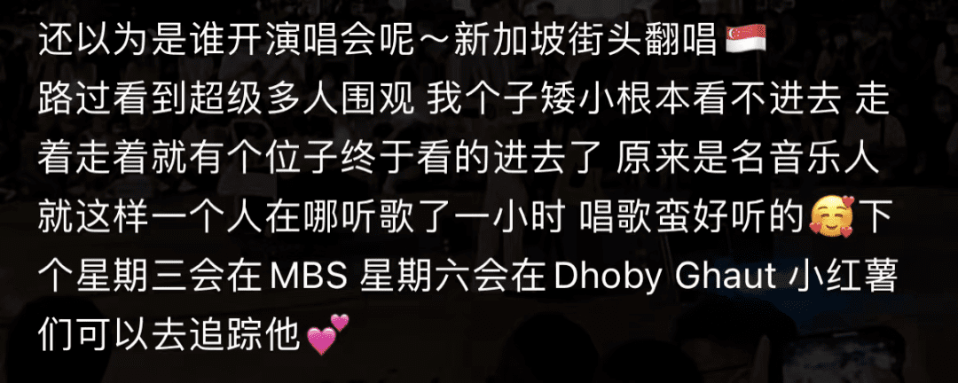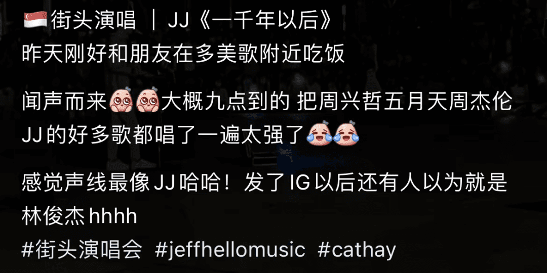 这个周末你有没有被刷屏?夜晚乌节路有一处人山人海!(图源:小红书@Lee Theng)路过的人都不禁被吸引,不仅因为人多还因为这是“林俊杰”的声音!(示意图:维基百科)上千人把一个男生团团围住,居然还有整齐划一的闪光灯和雷动的掌声,以及全场大合唱。原来,华语歌在新加坡这么火的吗?!街头华语歌手刷屏乌节路人山人海大合唱周六晚上这场表演在社交媒体上刷屏,大家都说在乌节路逛着逛着,突然间听到林俊杰的《一千年以后》,马上闻声找过来,结果一听就听了一整晚,感觉这个街头歌手声音最像林俊杰,几乎可以以假乱真。(小红书@治愈系小孩)(小红书@陈皮梅冰冰)还有人看到人多就凑过来了,个子矮都挤不进去,听了一会儿就走不动道了,最后挤着听了1小时。(小红书@优妮丝)我们再来看看当晚的盛况,可以说是里三层外三层人。很多人自发用手机闪光灯当荧光棒,随着歌声灯海浮动,现场气氛拉满了。是不是还有全场大合唱!好一个浪漫的夏夜↓(小红书@陈皮梅冰冰)这个叫Jeff的歌手最近每周在乌节路Cathay门口表演,知道他的人越来越多,这周末对比前一周有很大的进步。6月11日↓(小红书@慧)6月18日↓(小红书@优妮丝)还有网友直言自己像在“街头”追星,听了一场觉得不过瘾,然后查到原来周三也会在滨海湾MBS附近表演,专门踩着点又去了。(图源:小红书@AbtRQ)不仅仅是中文社交媒体刷屏,在Tiktok上面也有很多人分享,网友直言:兄弟可以去开演唱会了!话说最近新加坡的夜间生活真的很丰富,各种街头表演都出来了,有耄耋大叔在克拉码头演唱经典华语歌↓也有小鲜肉歌手给小女孩唱儿童神曲Babyshark~超级有爱↓很多人都说,喜欢这样的新加坡夜晚气氛太好了,一派生机勃勃~在新加坡街头表演是需要申请的,新加坡国家艺术理事会表示,最新一轮街头艺人面试有超过100人参与,申请率已恢复到疫情前的水平,街头艺人们的竞争也很厉害。深扒歌手来历驻唱多年,小哥哥已婚说了半天这个声线神似JJ的街头歌手原来是新加坡的音乐人Jeff Ng黄长俊,土生土长的新加坡人,驻唱已久。(图源:Esplande)我们在微博上能翻到,2018年就有网友提到过,无意中听见他驻唱表演,感叹声音太像林俊杰了。(图源:微博)这么多年Jeff还在从事街头表演的老本行,只不过观众从几个变成一大群人而已。听说还有粉丝后援会!(图源:FB)不过这位小哥哥可不是走偶像派路线,人家去年已经结婚。从Jeff的油管频道上,我们发现他还发行了原创单曲纪念他和太太的结婚一周年。(图源:YouTube@Jeff Ng 黄長俊)迷妹们不要伤心,我们好好听歌就好~根据曾经资料显示,黄长俊还曾参加过《中国好声音》的新加坡海选。Jeff现在日间的正职是一名音乐老师,从他各个平台的粉丝量和人气来看,离真正走红还有一段距离。(图源:FB@Jeff Ng 黄長俊)他的聪明在于很会选歌,一晚上唱遍林俊杰、五月天、周杰伦等人的经典老歌,首首华语好歌,带你穿越到华语乐坛的黄金年代。