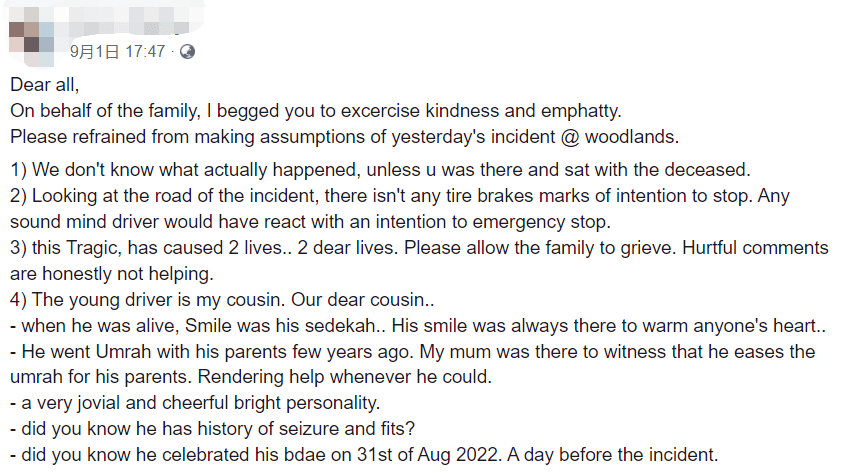 据家人透露,死者生前有着癫痫症病史,不知道这会不会是车祸发生的原因之一。