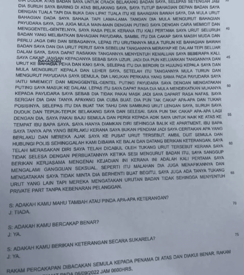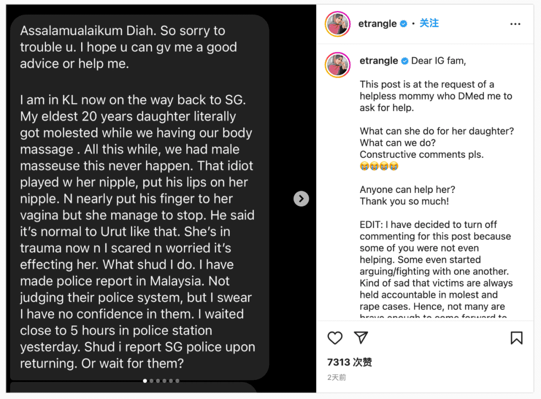 求助信息表示这对母女在吉隆坡进行全身按摩时,女儿受到了男按摩师对其女儿动手动脚,抚摸和亲吻其乳头,还差点被用手指侵犯下半身。
