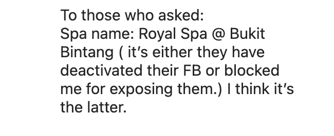 已经回到新加坡的这对母女在情急之下,才想到找到网红迪雅寻求帮助。在求助帖中,母女表示这家按摩店叫做Royal Spa位于吉隆坡的Bukit Bintang。