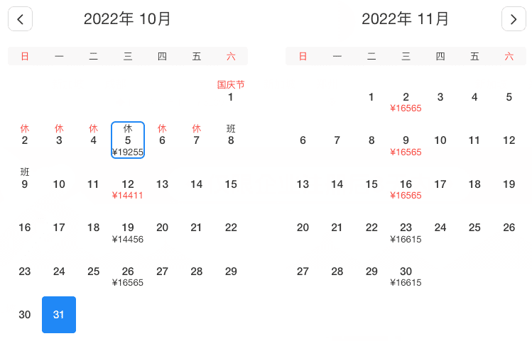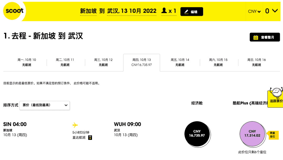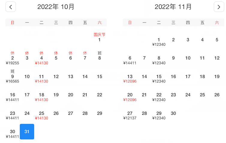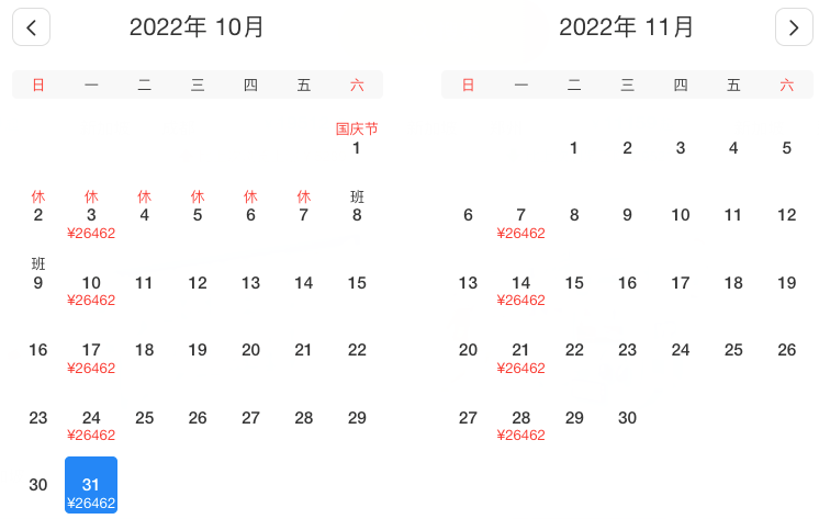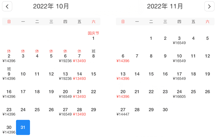 10月2、4、9、11、16、18、23、25、30日,最低¥14130