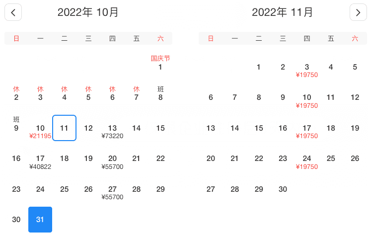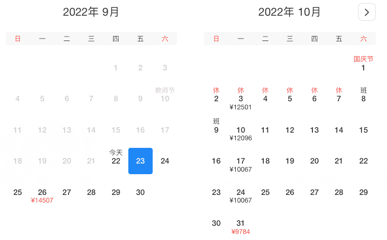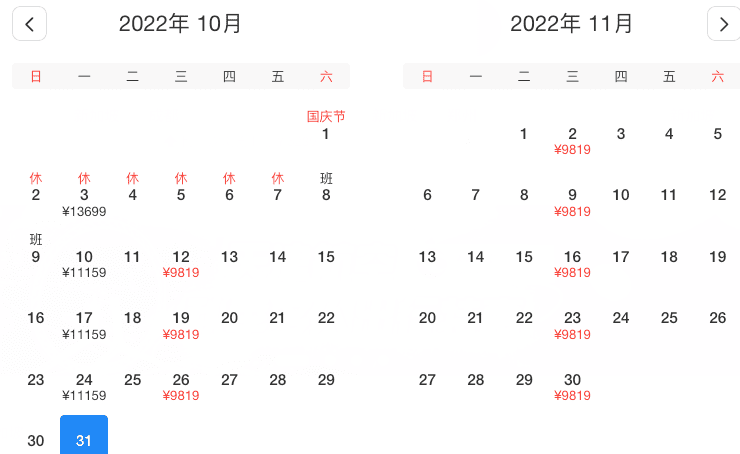 10月3、10、12、17、19、24、26日,价格在¥9819-13699之间浮动
