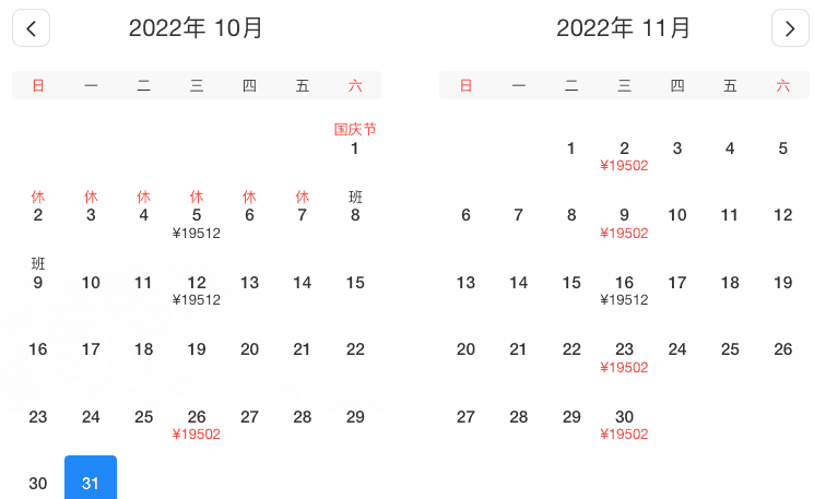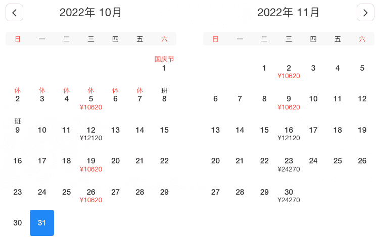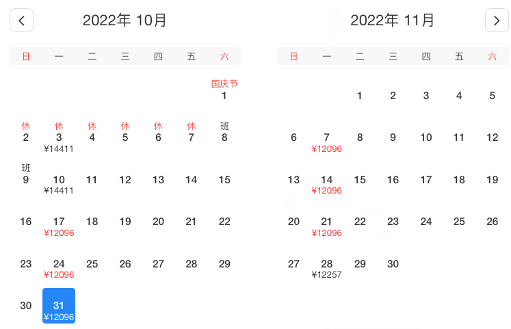 11月1、6、8、13、15、20、22、27、29日,最低¥12096
