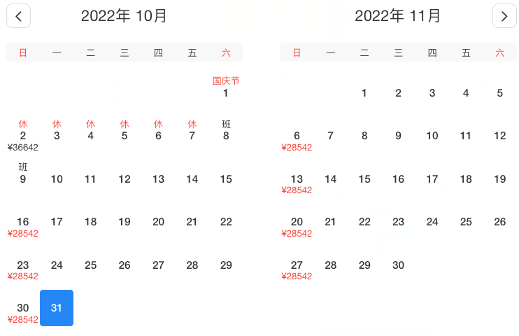 10月2、16、23、30日,价格在¥28542-36642之间浮动