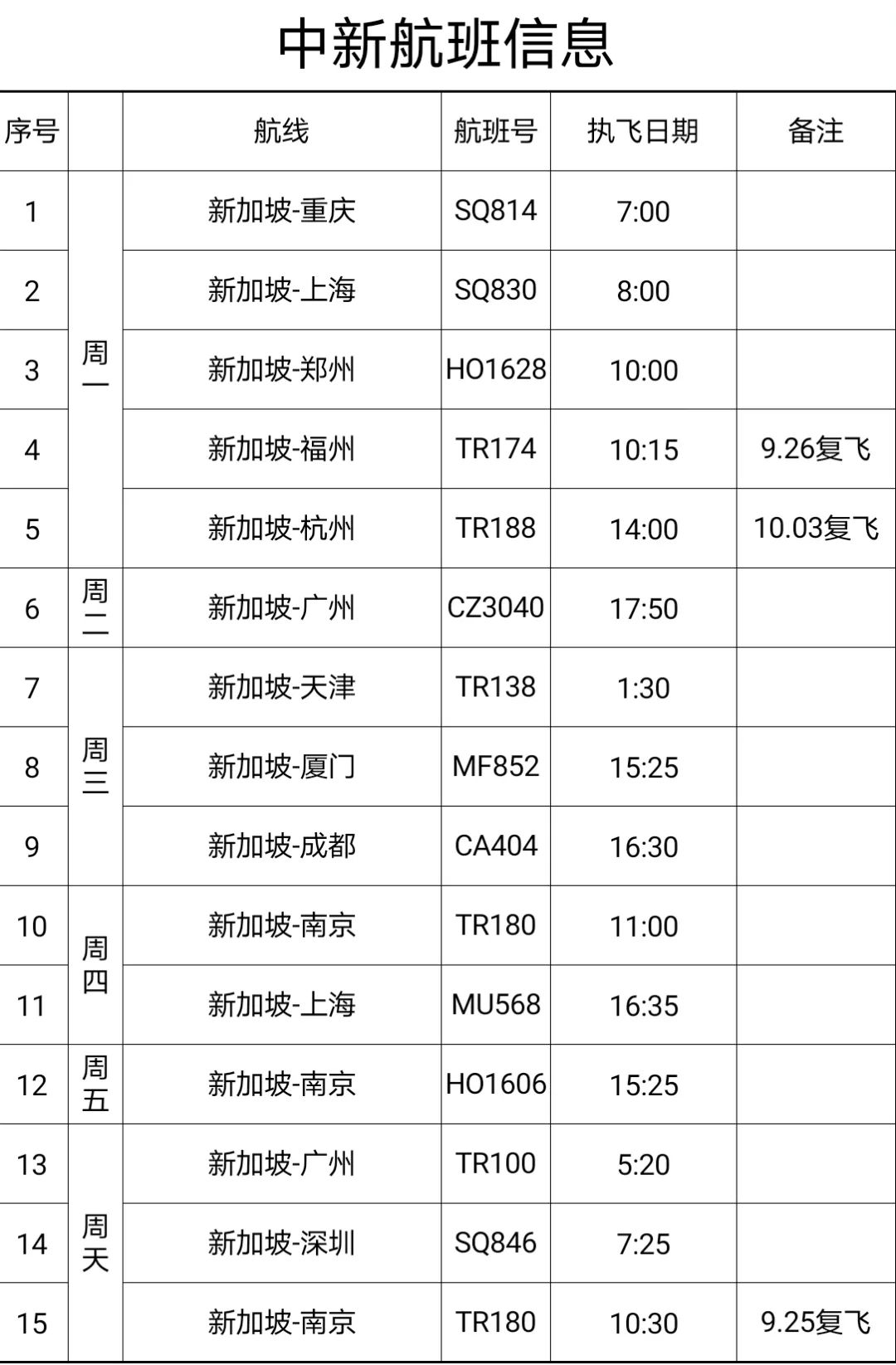 新加坡跟中国武汉复航、郑州增航!
