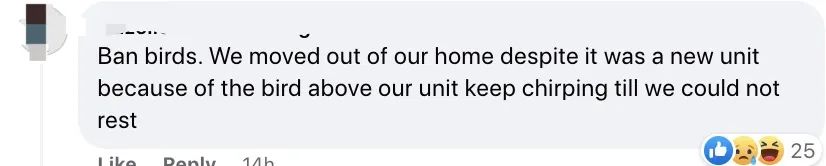 “直接把鸟给禁了吧,我之前也碰到过,我们家还是新公寓,但因为我们楼上的鸟也是一直叫,没法休息,最后还是搬走了。”