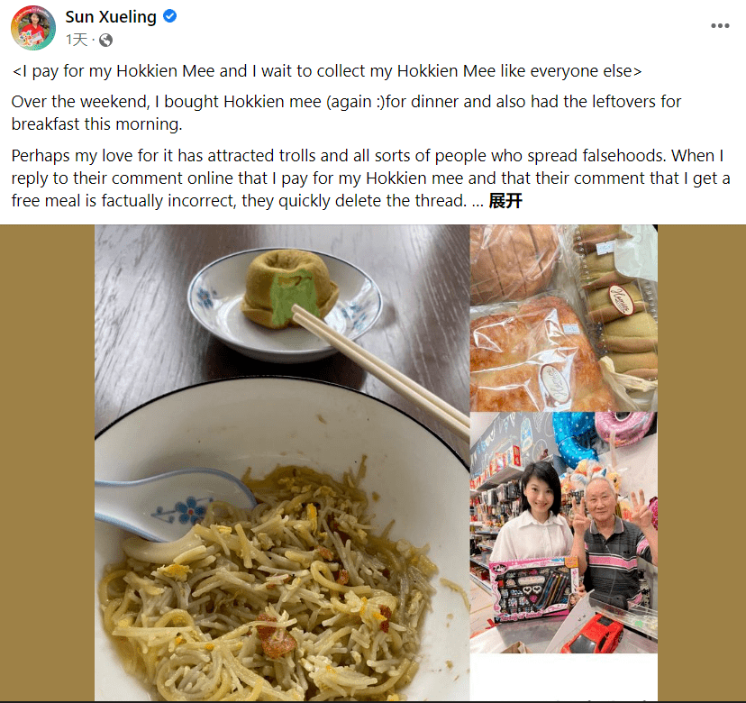 帖文中,她首先否认了自己利用议员身份吃白食的指控,表示她为这份福建面付了钱。