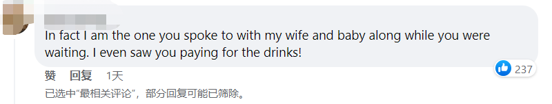 “事实上,我的妻子和孩子当时正在和你交谈。我甚至看到你付了饮料钱!”