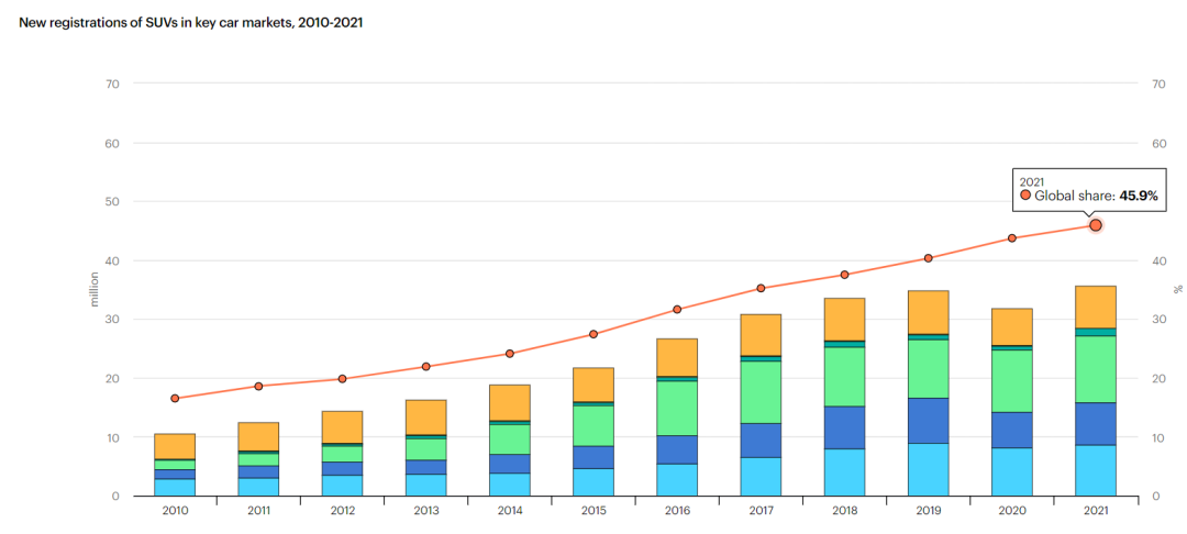 在全球汽车重要市场SUV销量已经占据新车近一半份额,图源:iea.org