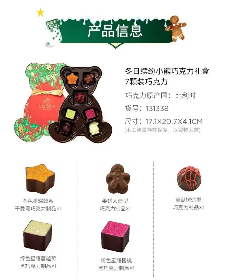 歌帝梵的巧克力有多绝?自创建起就为比利时皇室所御用!选材上乘,制作严谨,把巧克力的色香味发挥到了极致!常被称为欧式巧克力代表。这款圣诞冬日缤纷巧克力系列,恰是以独特匠心打造浓醇蜜意,提前让大家“丝滑”过圣诞。而且,这次歌帝梵带来了3种“特色”:树形、立方状、小熊