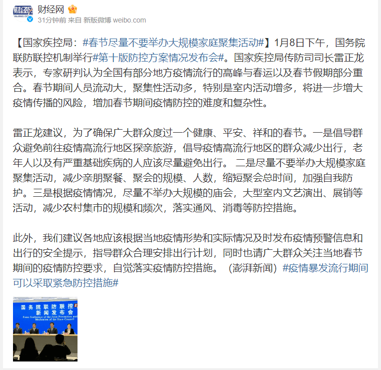在今天下午,中国国家疾控局召开了“第十版防控方案情况发布会”,宣布了国内疫情的最新态势,并对来临的春节庆祝活动做出了指示: