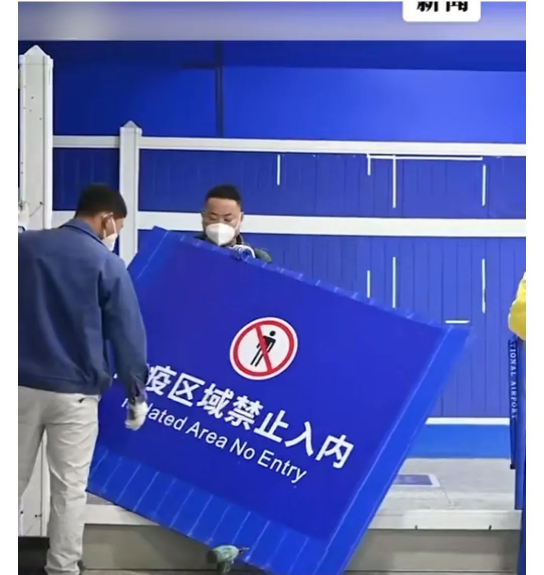 无独有偶,今天凌晨,上海浦东机场的工作人员,也被拍到了正在撤除机场国际及港澳台到达处的防疫隔离设施。
