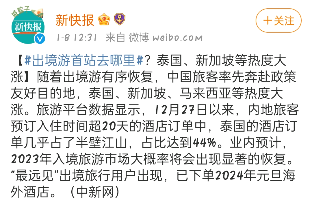 在一众旅游国家里,东南亚的新马泰成为了很多人最青睐的目的地。媒体报道,甚至已经有人将行程排到了2024年元旦,提前一年为出国游做准备。