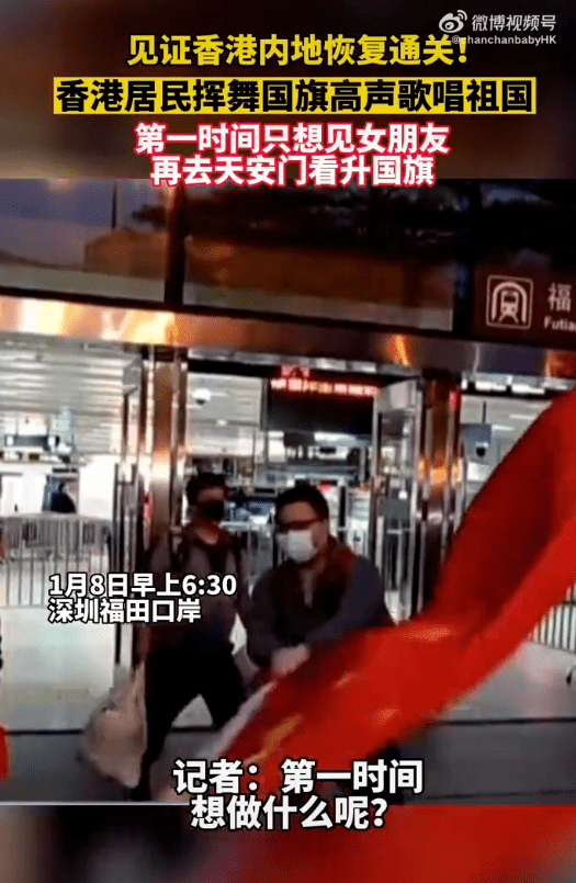 在通关现场,有人被抓拍到在福田口岸挥舞国旗高唱《歌唱祖国》,兴奋之情溢于言表。