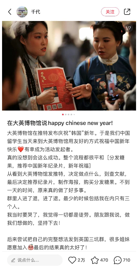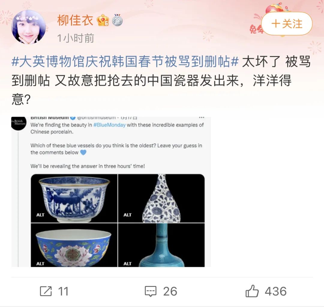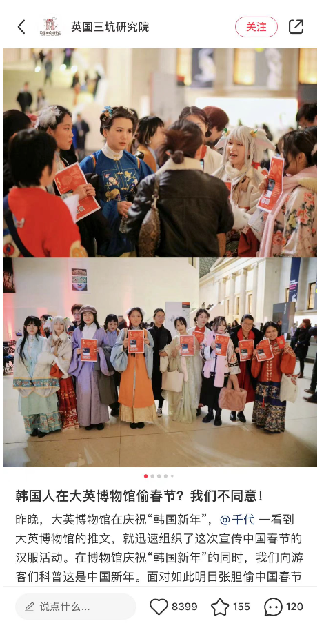 更过分的是,帖文还链接到了大英博物馆,于官网发布的一则题为“庆祝韩国新年”的文章。