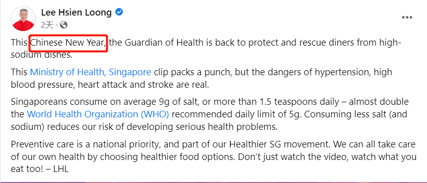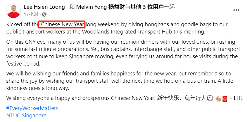 新加坡总理李显龙,在脸书发文庆贺新年时,从来都只用“Chinese New Year”。