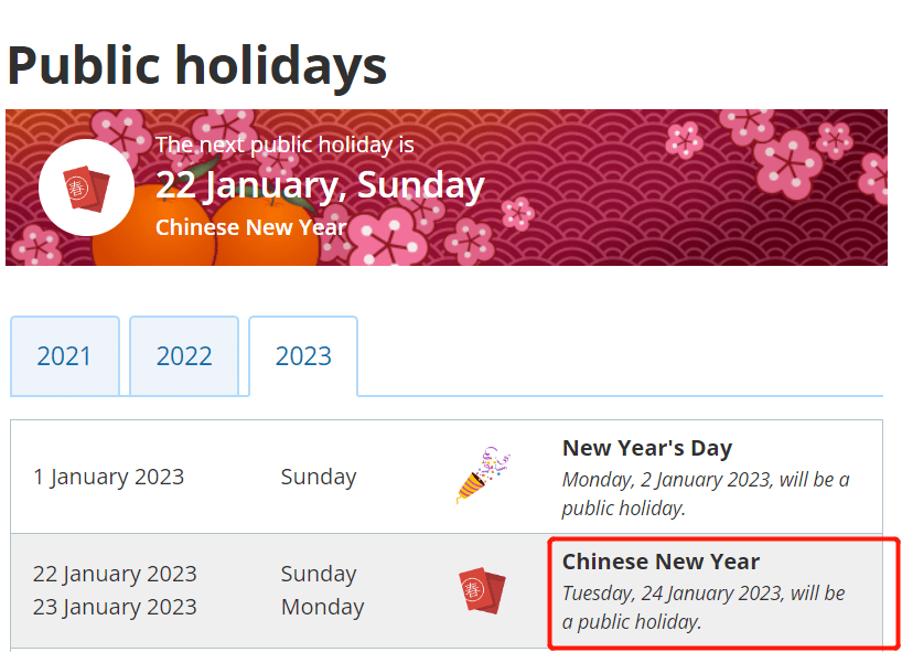 新加坡人力部官网上的公共假期日期,显示的也是Chinese New Year。