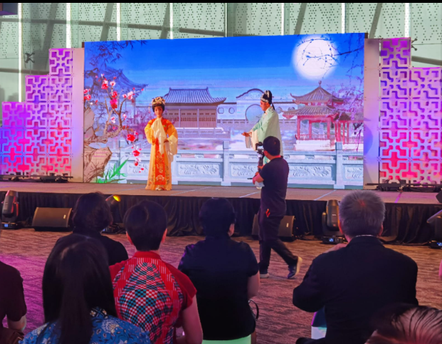 庆会节目中有很多中华特色节目,例如戏曲和民族乐器表演。