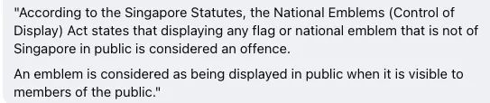 “我们自己新加坡人都只能按照政府规定的日期挂国旗。这人不能这么做吧。”