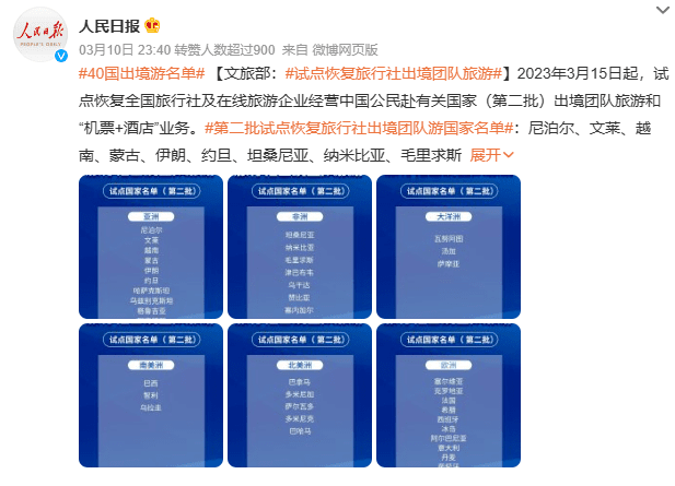 从3月15日起,中国试点恢复全国旅行社,及在线旅游企业经营中国公民赴有关国家(第二批)出境团队旅游和“机票+酒店”业务。