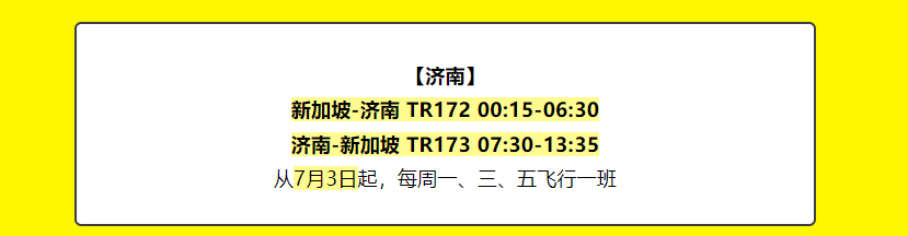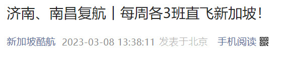 3月8日,恢复新中航班最“勤快”的新加坡酷航又官宣:7月份起,新加坡将于中国济南、南昌复航。