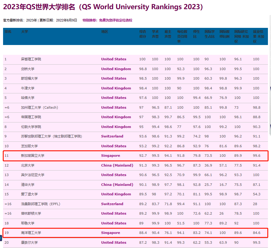 2023年QS世界大学(QS World University Rankings 2023)里,新加坡还有两所大学跻身前50名顶尖大学行列!