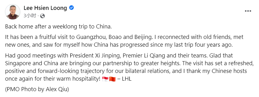 结束近一周的行程,李显龙于今天返回了新加坡,第一时间他就在个人脸书上回顾了这次的中国之旅。
