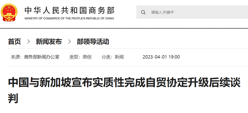 昨天,在新中两国总理的见证下,新加坡贸工部部长颜金勇与中国商务部部长共同签署了《中华人民共和国商务部和新加坡贸易与工业部关于宣布实质性完成中国—新加坡自由贸易协定升级后续谈判的谅解备忘录》。