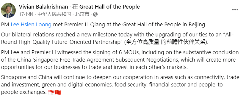 新加坡外交部长维文医生,也在第一时间在脸书上通报了进展,将昨天称作是“新中关系的新里程碑”。