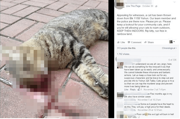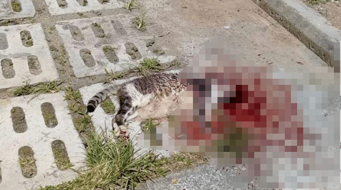 2018年,义顺第367座组屋旁的停车位,有猫暴尸停车场,身上物明显外伤,头部却遭到重创。同年,义顺第147座组屋发现死猫,猫咪身体扭曲,近的地板和楼梯口都有斑斑血迹。