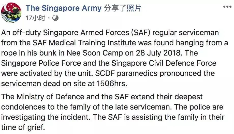 据新加坡武装部队发布发布的消息,在义顺军营内,发现一名武装部队医疗训练学院的正规军人被吊死营房里的一根绳子上。