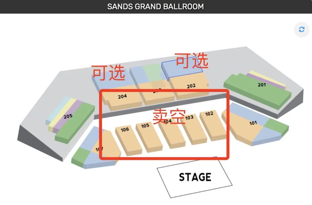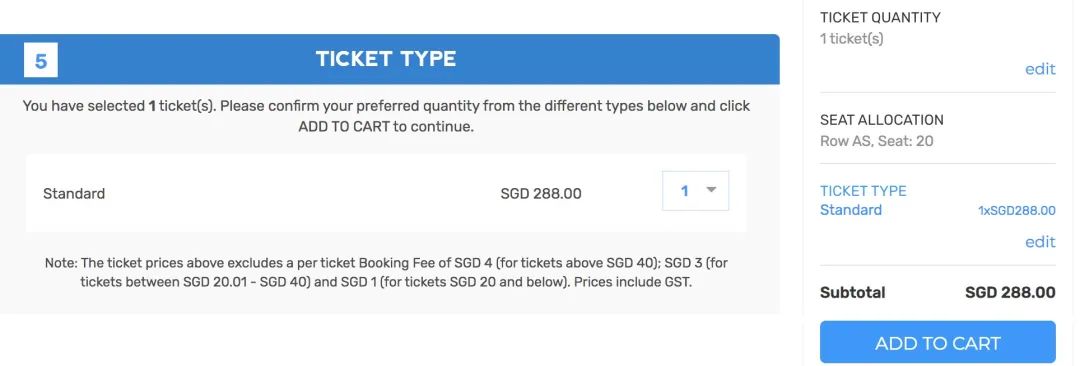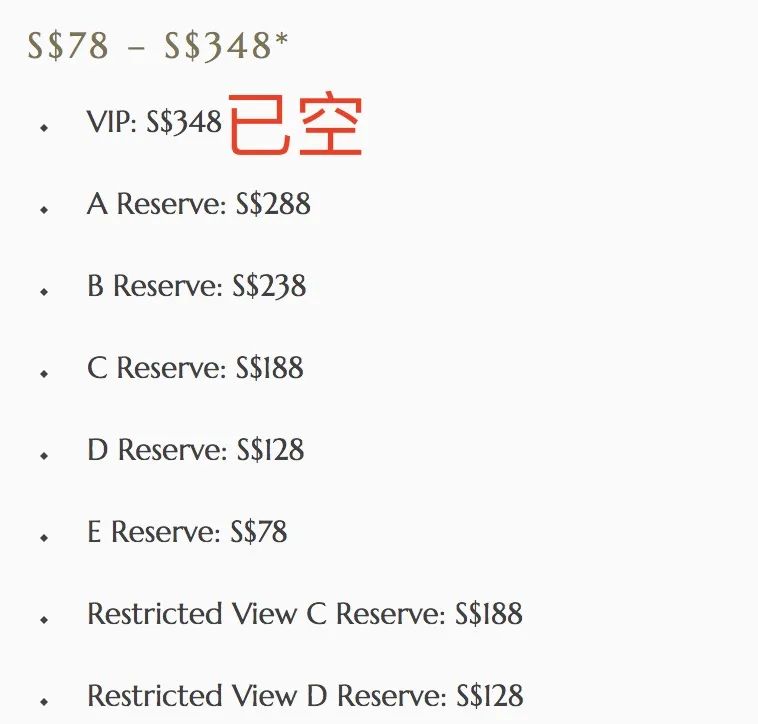 卡其色区域,一张门票官方售价348新元现在已经无票可选。剩下价值288新元的蓝区座位可选。