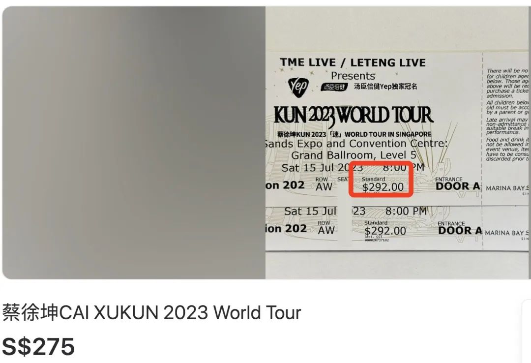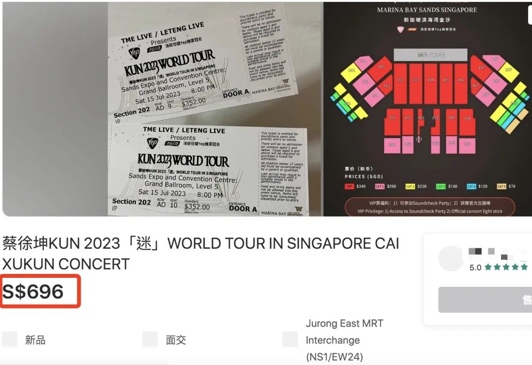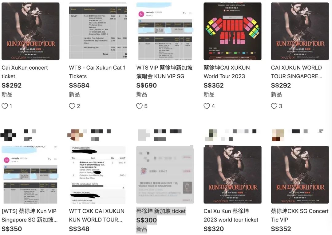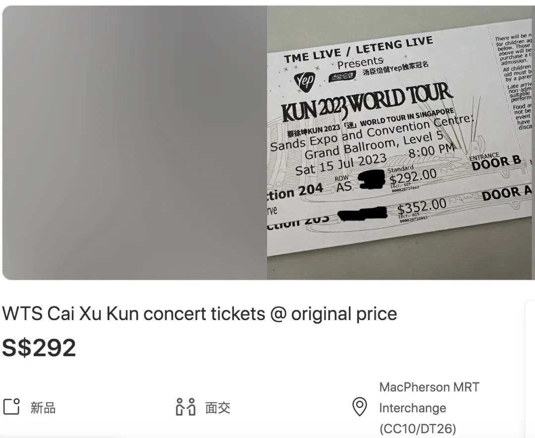 在新加坡本地的二手交易网站上,还能看到有人以更高价格出售蔡徐坤的演唱会门票。↓