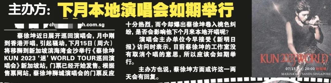 今年7月15日(下周六),蔡徐坤在新加坡有一场演唱会。截止椰子发稿前,蔡徐坤新加坡站巡演门票仍然可以购买。