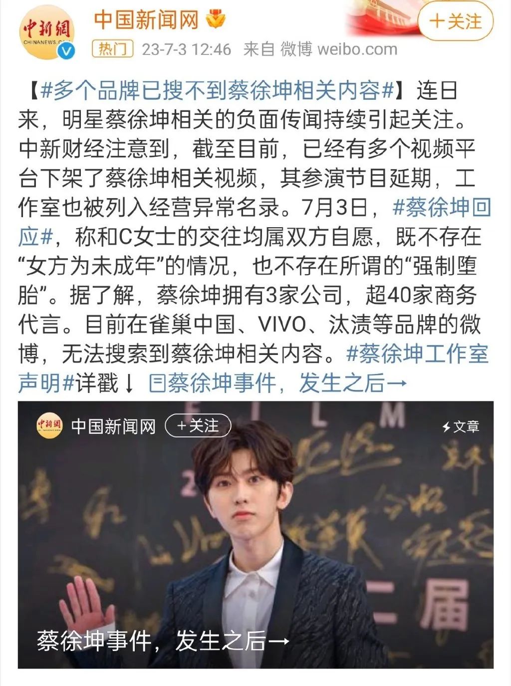 蔡徐坤今天已经正面回应,而今天的新瓜也是假瓜,下一步,事态会就此平息吗?