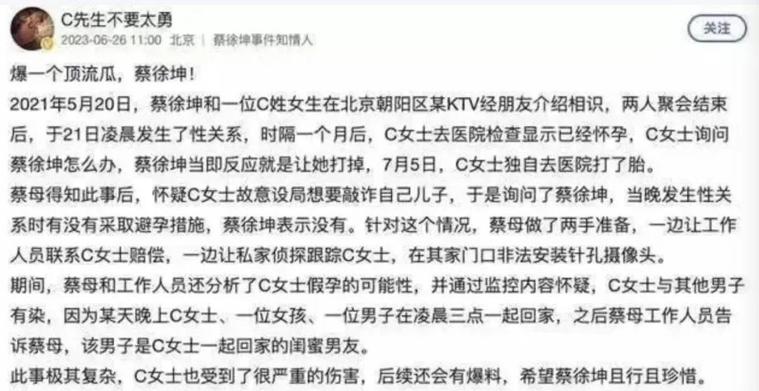 ①跟未成年女性C女士发生一夜情,要求怀孕堕胎,蔡徐坤亲妈雇侦探非法装针孔摄像头调查