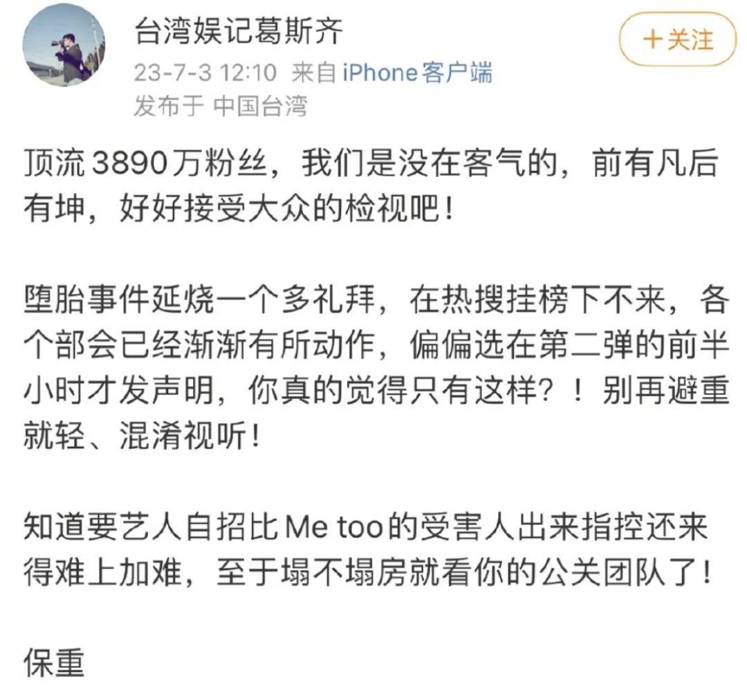 而今天,中国网络上除了蔡徐坤本人回应,蔡徐坤的工作室也正面发文表态,强调以下2个重点: